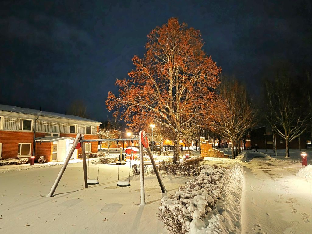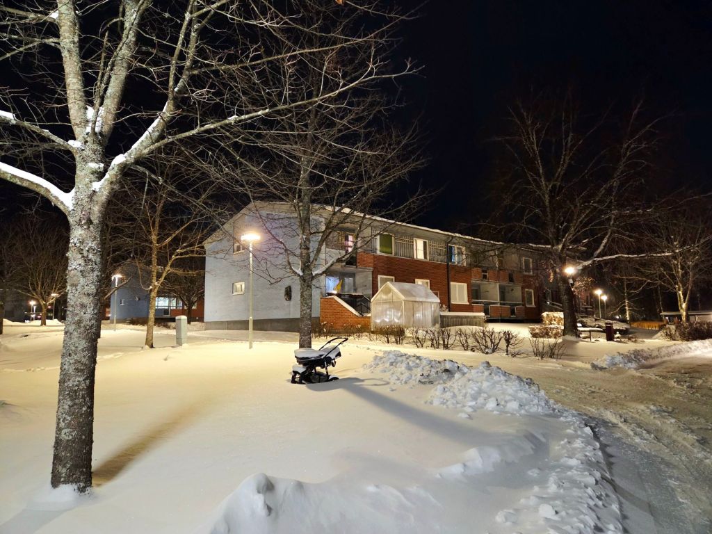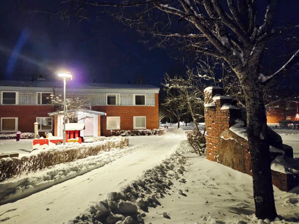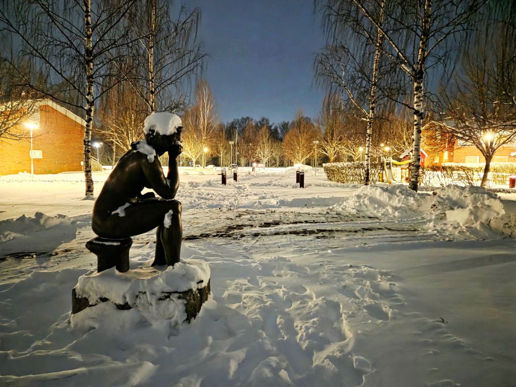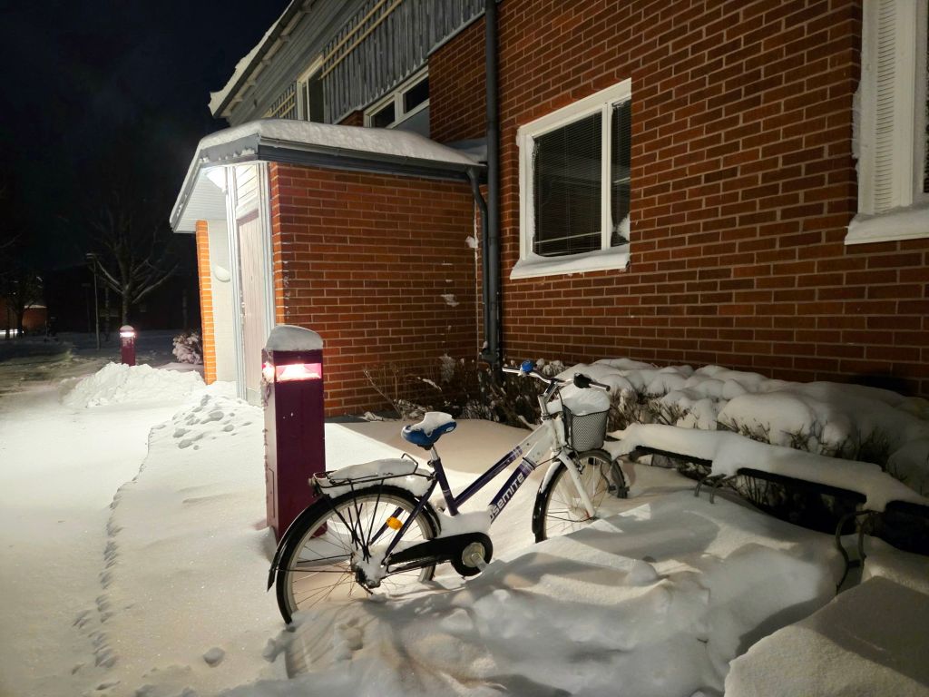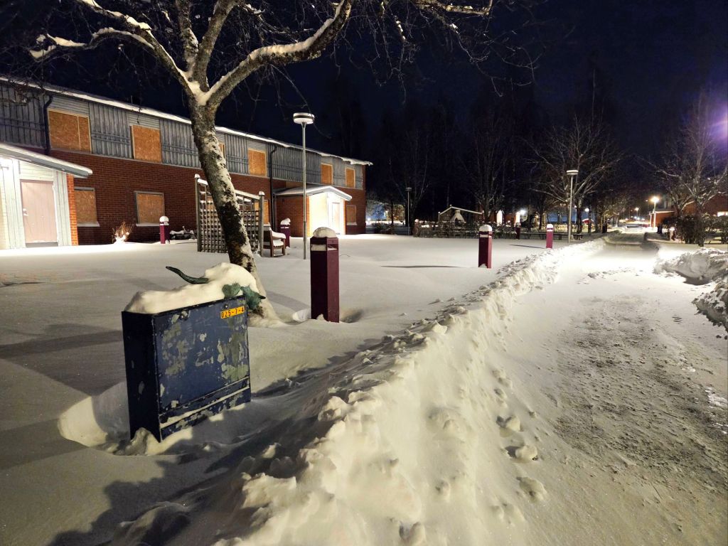 Framåt kvällen slutar det snöa, så jag får för mig att gå ut en sväng, trots allt. I väderappen står det att temperaturen är minus sju, men känns som minus femton, vilket nog stämmer ganska bra eftersom en kraftig nordan får kinderna att frysa fast omgående.