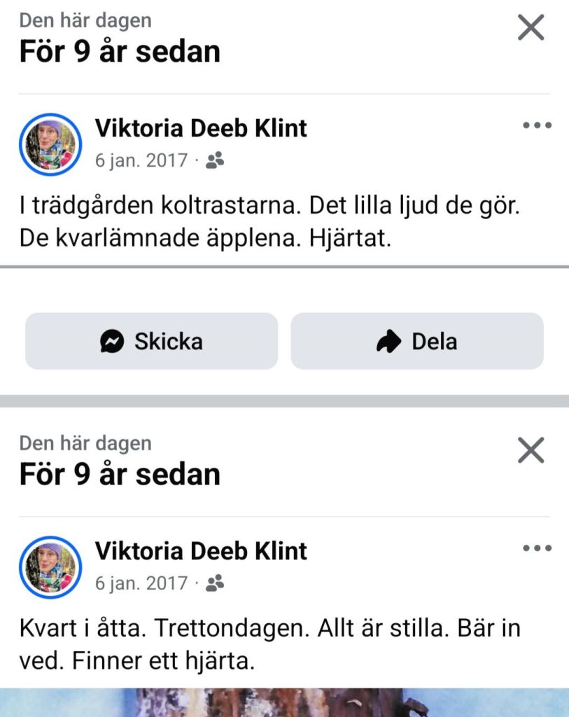 Bland mina fejanminnen dyker det upp två från för nio år sedan, hemma på Hässelby. Jag läser dem med stort vemod, men det känns ändå så trösterikt att ha fått fira den här dagen med vänner. Det gör saknaden lättare att bära.