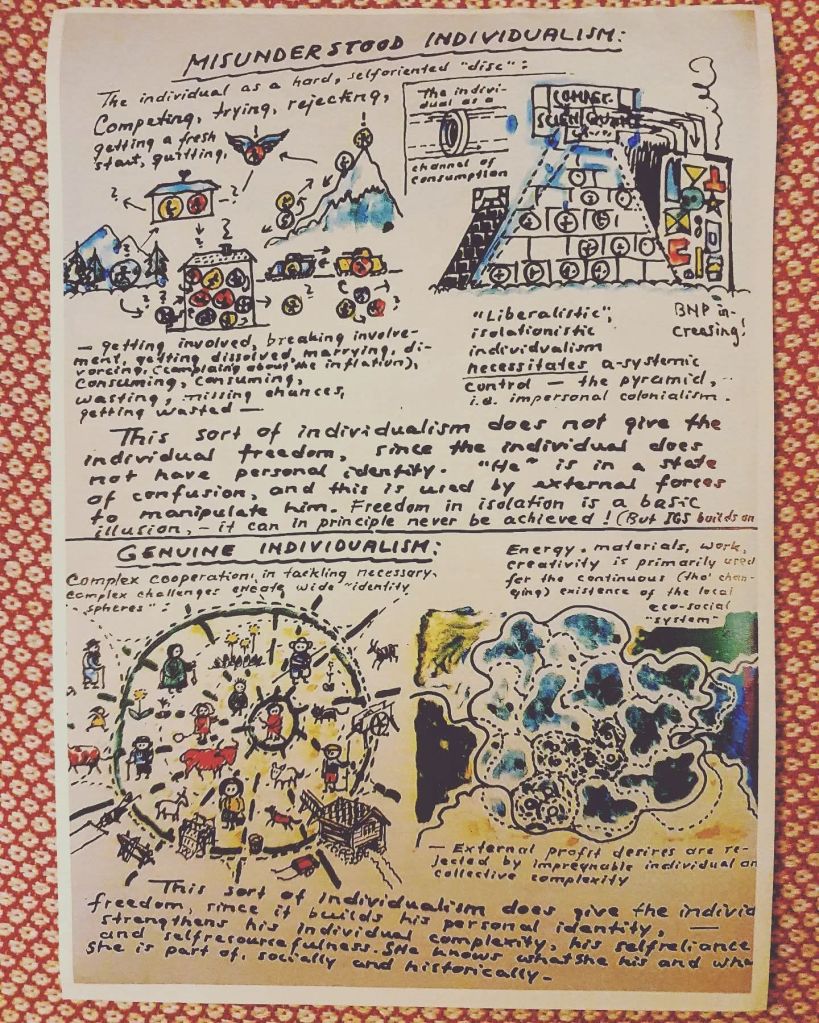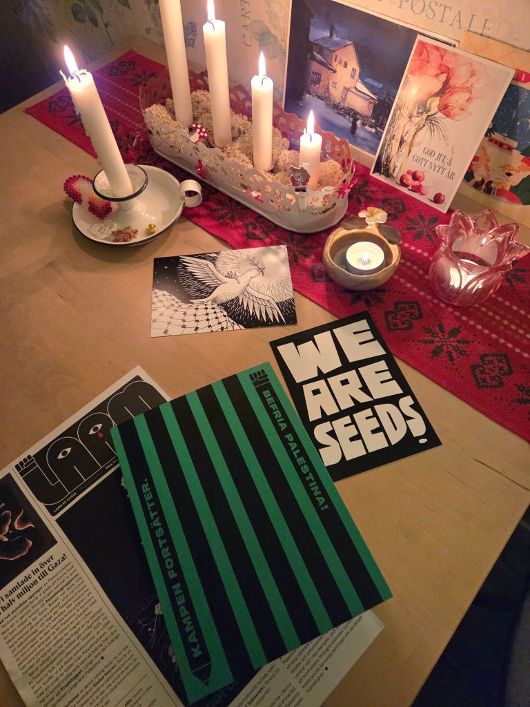 Jag tänker på all den kolonisering och exploatering som pågår både nära och långt borta (geografiskt sett) och på att krig och förstörelse är big business och att det finns en massa gubbjävlar som tjänar storkovan på dem. Känner mig när allt kommer omkring rejält uppgiven ändå. Hur mycket jag än tycker att det är en känsla som jag inte får ge efter för. Men. Acceptans. Just här och nu, säger jag till mig själv, ger jag mig tillåtelse att känna uppgivenhet och att vara djupt och innerligt ledsen över världens tillstånd. Parallellt med detta känner jag tacksamhet över en hel massa saker. En av dem är att jag fick stanna till hos min käre vän A i Stadra, sitta i hans hemtrevliga kök och äta hans goda karelska svampsoppa, lyssna till rolig musik och ta en promenad tillsammans med honom vid sjön Grecken. Och när jag kommer hem har Tecknaruppropets nya Palestinabok kommit med posten, som en påminnelse om att tillsammans är kraft, tillsammans är solidaritet, tillsammans är möjligheten till förändring.