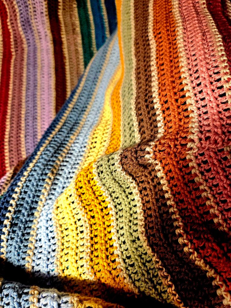 Lyssnar till Sim Kerns egen inläsning av Genocide Bad och virkar vidare. Just här och nu har avgrunden öppnat sig och jag famlar omkring i mitt inre mörker. Kanske behöver jag bara få sova en natt utan mardrömmar. Kanske kommer allt att kännas bättre när jag vaknar. Ett varv till bara. Pausar den mycket hörvärda ljudboken för att lyssna till Tom Waits en stund istället. Hans lugnande vaggvise-tröst-röst får bli en fyr i natten. Ett varv till. Ny färg. Varje maska är en liten bön.
