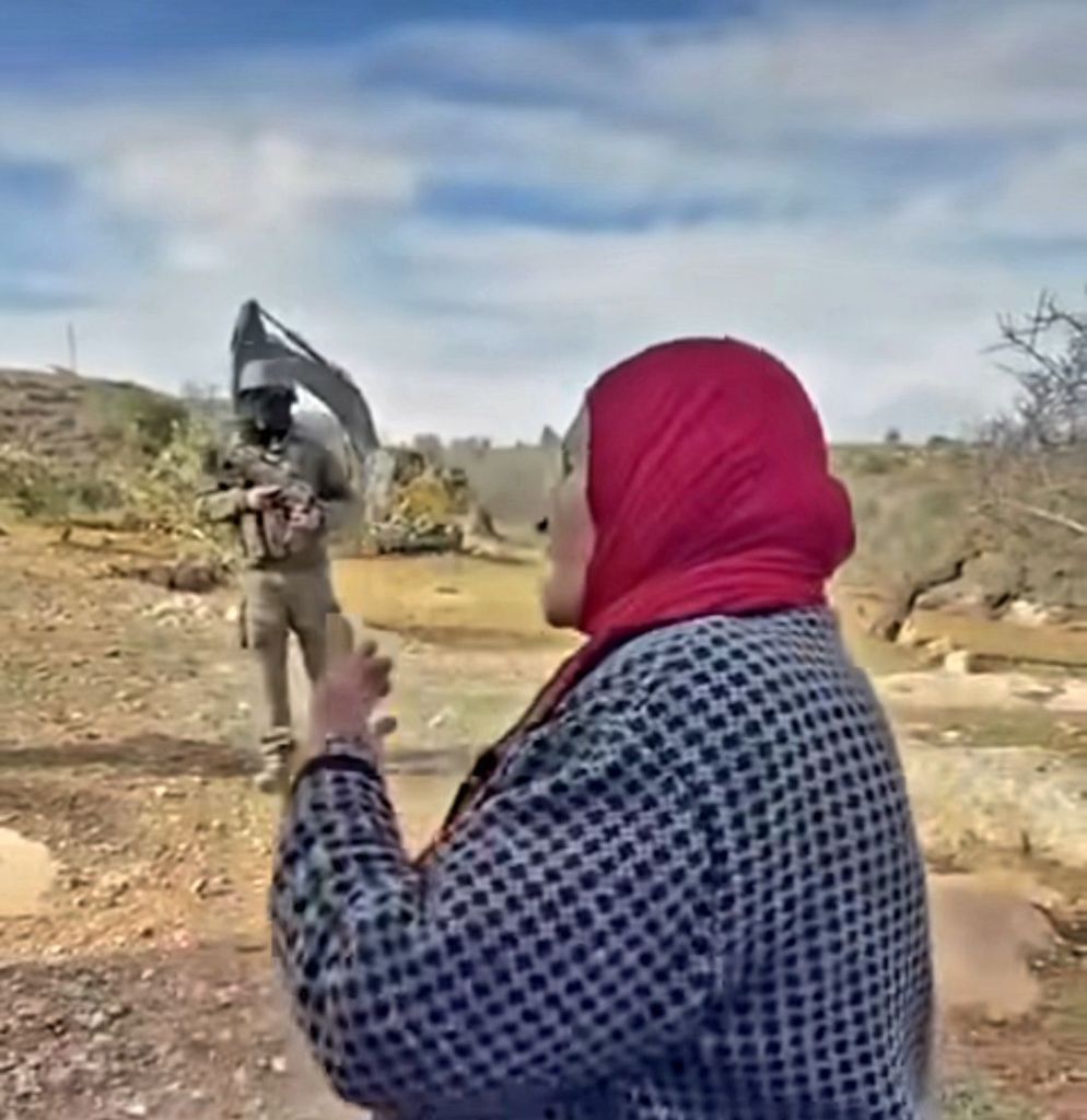 Hon står där, bara står, men kan ingenting göra. Hur förhandla med en kalasjnikov? Hur förhandla med den likgiltighet inför livet, den brutalitet och alienation som utmärker ockupationen? Det högmod och den rovgirighet som anser sig ha rätt att stjäla, mörda och våldta, att fördriva människor och djur från deras hem, att ödelägga allt?